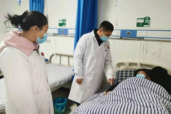 譚波(右)和院內醫生到病房探望患者、與患者交流。暨龍鎮衛生院供圖