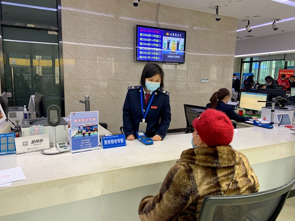 在潼南區行政服務中心稅務大廳,稅務人員在“愛老敬老專窗”為老年人辦理繳費業務。向倩瑋攝