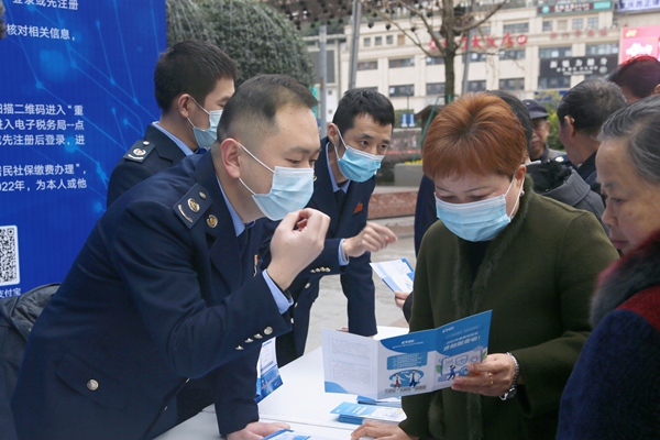 大渡口區稅務人員在大渡口步行街涉稅咨詢點宣傳醫保政策。陳語詩攝