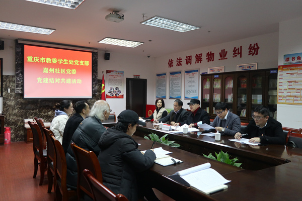 人民網重慶12月27日電 為加強和推進社區黨組織建設,凝聚各方力量,發揮黨建對基層治理的引領作用,更好地服務群眾,12月25日,渝北區龍溪街道嘉州社區黨委與重慶市教委學生處黨支部開展了結對共建黨建工作交流活動。