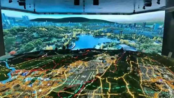 在規劃館理,打造光影藝術裝置, 光柱錯錯落落, 展示公園城市、 城市基礎設施、 生活配套、 會展商貿等民生信息。走進光影通道,渝北藍圖緩緩開啟,一座開發開放的前沿陣地呈現在眼前,以多層立體地圖的形式展現了渝北用好大通道、 構建大樞紐、 打造大口岸, 深度融入“陸海新通道”。