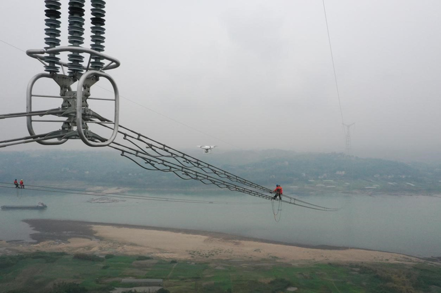 1月12日,輸電運檢人員對白鶴灘-江蘇特高壓工程(重慶段)長江大跨越區段開展各種設備的檢查驗收工作。李濤攝