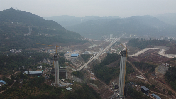 人民網重慶1月16日電 1月15日,云開高速項目黃石特大橋主墩封頂儀式舉行。高130.5米9號墩順利封頂。