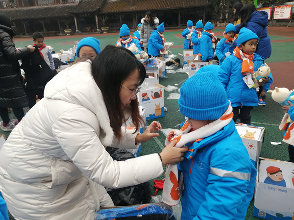 捐贈儀式上,愛心團隊向孩子們送去了真切的問候,表達了親切的關懷,寄予了殷切的期望,并把溫暖包送到了孩子們的手里,幫他們換上了嶄新的棉衣、棉鞋和圍巾,在隆隆寒冬傳遞著暖暖情意。孩子們稚嫩的臉上洋溢著幸福的笑容,為這個冬日增添一抹暖陽。