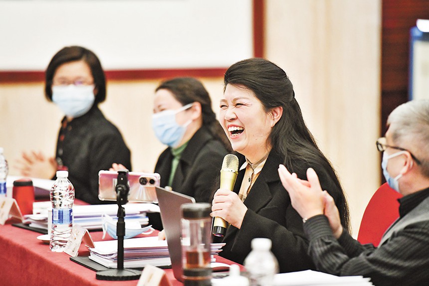 一月十九日,在分組討論時,政協委員范慧(右二)就未成年人保護、農村留守兒童身心健康等問題發言。她說到精彩處時,參與小組討論的政協委員們紛紛鼓掌。記者 謝智強 攝\視覺重慶