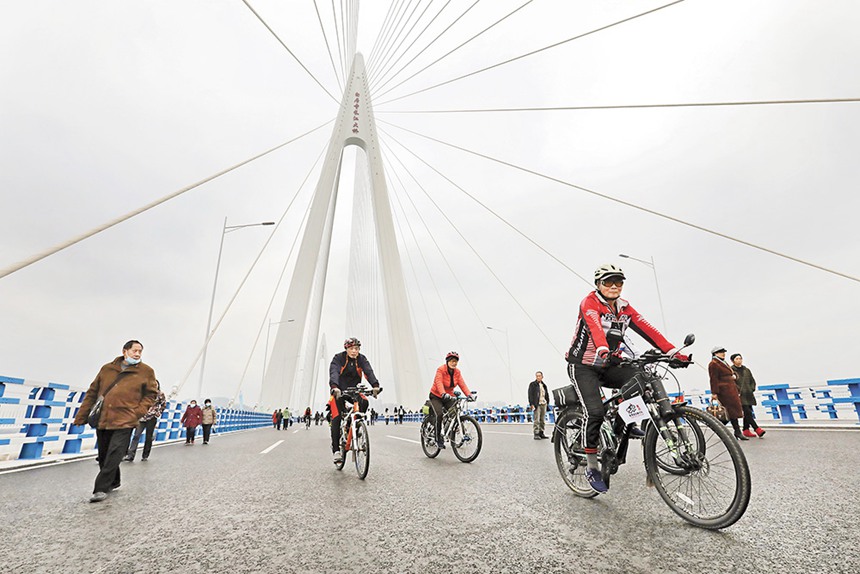 1月22日,市民在白居寺長江大橋“踩橋”,游覽、拍照,感受橋梁的壯美。