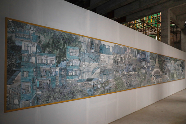 為創作《街坊鄰居》,傅文俊曾耗費5年多時間走街串巷,用鏡頭收集散落在重慶城市邊緣的瀕臨拆遷的吊腳樓,記錄它們“風韻猶存”的倩影。在共計370張成片中,傅文俊選出37張照片進行復原、重新規劃以及藝術演繹,最終形成了這幅長達12米的《街坊鄰居》。