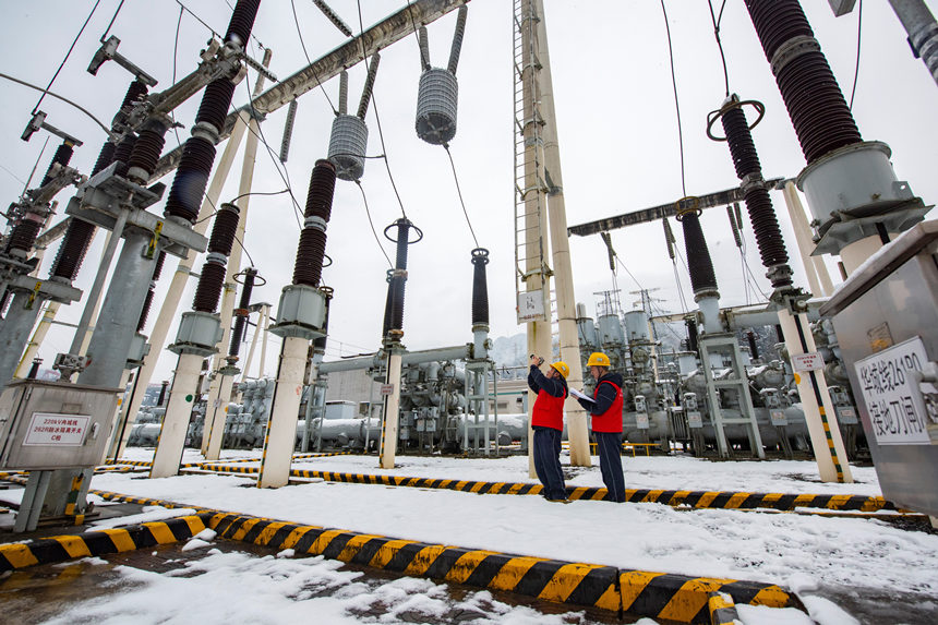 國網重慶城口供電公司員工程渝、劉家豪在220千伏集控站對融冰裝置進行紅外測溫。牟丹陽攝