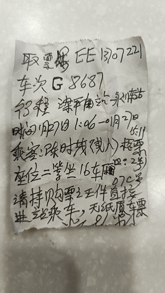 1月27日,一名年近七旬的旅客獨自從重慶梁平南站乘坐G8687次列車前往重慶永川東站。站臺上,老人拿出一張“手寫車票”向列車工作人員咨詢乘車情況。