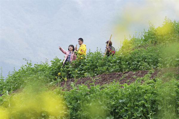 杜曉睿(圖左)和村民探討如何利用油菜基地發展鄉村旅游。秦廷富攝