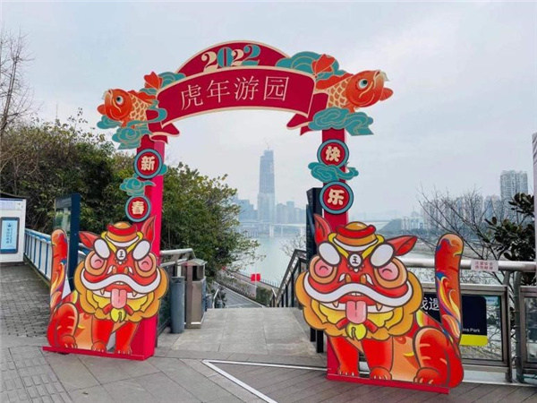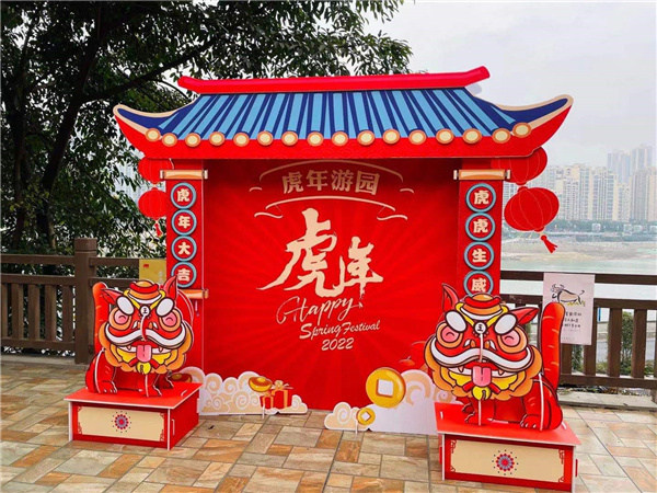 據悉,活動內容以新年祈福、紙藝手工體驗、拓印新春“!弊值热N形式展現。在李子壩輕軌穿樓觀景平臺,設置有虎年游園的入口裝置,觀者可以根據沿途的指示和燈籠氛圍裝飾,到達李子壩抗戰遺址公園內的觀景平臺體驗新春活動,F場還設置有虎年打卡裝置,供觀者進行打卡紀念。