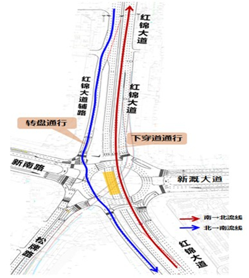 具體疏導方案為:1.原紅錦大道通過新牌坊立交下穿道進城的車輛(或往紅旗河溝方向)改道為:由紅錦大道—紅錦大道輔路(中國電信)—新牌坊立交轉盤—紅錦大道輔路—紅錦大道行駛。2.原紅錦大道通過新牌坊立交下穿道出城的車輛(或往人和立交方向)改道為:借用原新牌坊轉盤進城方向下穿道通往紅錦大道人和方向行駛。