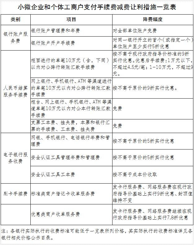 此次支付手續費降費措施,聚焦小微企業和個體工商戶降費呼聲高、使用頻度高的基礎支付服務,涵蓋銀行賬戶服務、人民幣結算、電子銀行、銀行卡刷卡、支付賬戶服務等5方面12項措施。其中,票據業務降費期限為長期,其余降費措施優惠期限為3年;票據業務、銀行卡刷卡降費對象對所有客戶(商戶),其余降費措施對象為小微企業和個體工商戶。