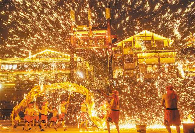 2月15日晚,沙坪壩區磁器口古鎮,一條銅梁龍在漫天火花中飛舞。記者 張錦輝 攝/視覺重慶