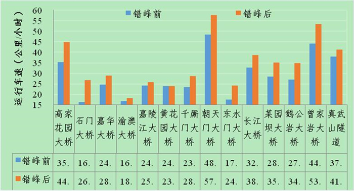 二是錯峰橋隧高峰時段平均車速為34.4公里/小時,較錯峰前同比提升20.2%,其中高家花園大橋及復線橋、朝天門大橋、曾家巖大橋等高峰時段車速平均提升超過9公里/小時。