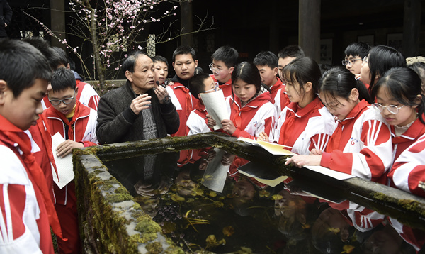 人民網重慶2月17日電 “這個石墩上面雕刻的是核桃仁,代表做人要仁義”“這上面刻了一首《陋室銘》,表示當時的主人希望他的后人做人要低調,生活要簡樸,懂得節約”。2月17日,新學期開學第二天,涪陵區青羊鎮陳萬寶莊園內,青羊鎮文化服務中心負責人熊中圣正在給涪陵六中的學生們宣傳講解陳萬寶莊園所蘊含的傳統文化內涵,并教導孩子們做人的道理。