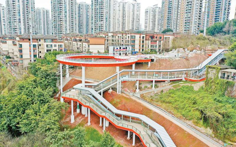 2月17日,南岸區蘇家壩步道觀景平臺主體工程全部完工,目前工人正加緊綠化和裝飾收尾工作。據了解,蘇家壩步道觀景平臺項目起于軌道3號線銅元局站止于雙峰山路,包括人行步道、觀景平臺、電動扶梯及燈飾等,其中觀景平臺由大小兩個圓環組成。該項目建成投用后將成為市民和游客觀賞蘇家壩立交和菜園壩長江大橋的好去處。