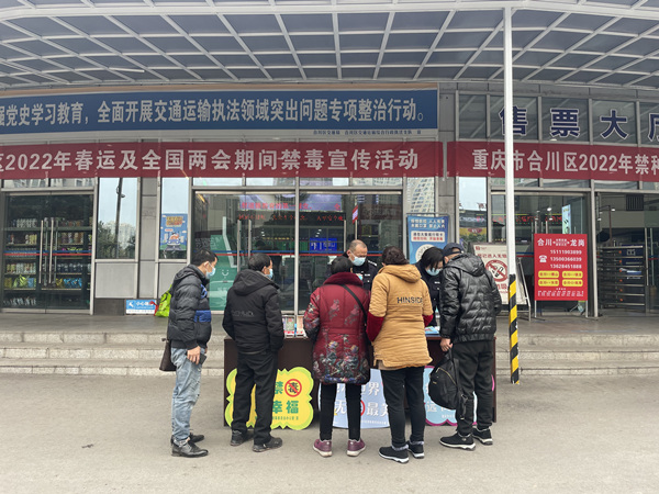 人民網重慶3月2日電 “看著民警做禁毒宣傳這么辛苦,我們也該出份力!”2月28日上午,在合川區汽車客運中心安檢入口處,客運中心的工作人員在例行安檢工作后,還特意拿出民警給的宣傳資料,并用從民警那兒學來的禁毒常識,對每位進站乘客進行簡短的禁毒宣傳。