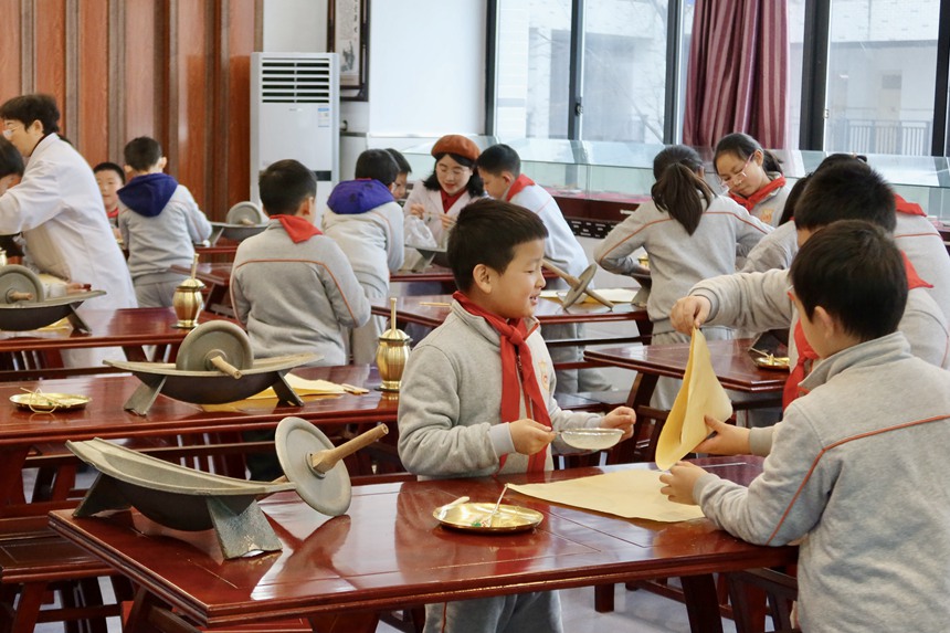 縱橫交錯的棋盤,在對弈中演繹無窮變化,啟迪孩子的智慧;書法館里,書法老師細致講解執筆方法和運筆要領;四大發明體驗館中,同學們可以親身參與排版、勻墨、上墨、拓印、揭紙等流程,感受活字印刷的魅力;中醫藥館中,醫者則化身師者,帶領學生走進歷史久遠的中醫藥文化。