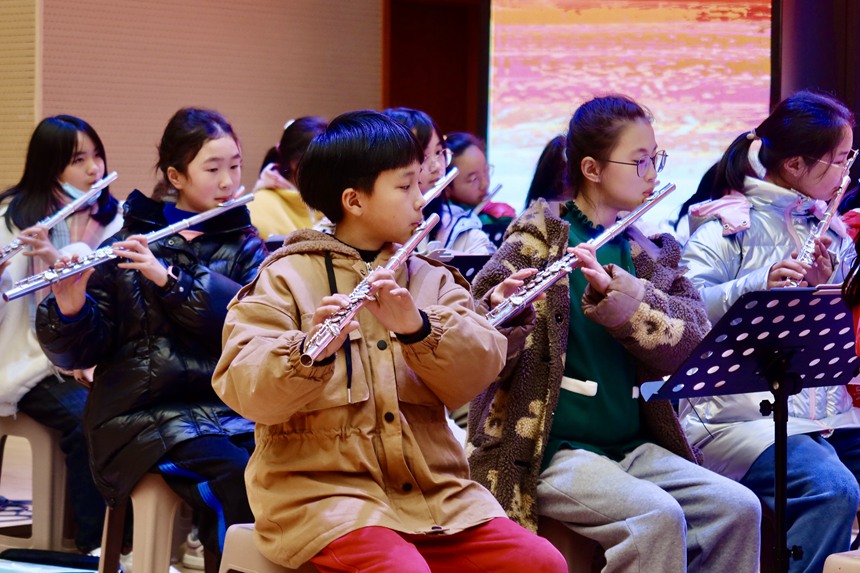 操場旁,室內籃球館剛剛投用,館內的舞臺上,學校合唱團和管樂團的孩子相繼亮相,開始屬于自己的“演出”……