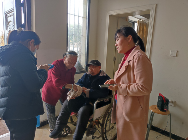千盞村“服務員”聯系政府社保所工作人員入戶為行動不便老人開展養老生存認證工作。大盛鎮供圖