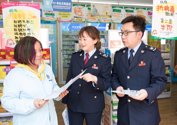 近日,重慶市南川區稅務局向個體工商戶和小微企業宣傳稅費優惠政策,圖為該局工作人員在桐君閣藥房宣傳政策。焦相寅攝