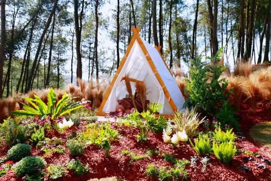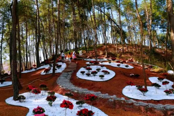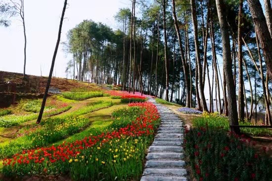 人民網重慶3月13日電 郁郁蔥蔥的松樹直沖云端,透過樹林的陽光灑在林下的草坪上,光影斑駁,綠草如茵,一幅森系畫卷映入眼簾。安的童話森林位于渝北興隆鎮南北大道旁,交通便利,地理位置得天獨厚。整個園區利用鄉村原始松林,以植物造景為主,配以童話人物、湖泊、松林、郁金香、繡球花等,構成了富有高低錯落、顏色交錯的自然空間,呈現了“自然、寧靜、童真”為特色的森林景觀。