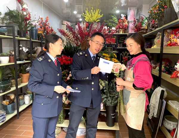 武隆區稅務局稅務人員向商家宣傳規范的發票開具流程,并送上“發票維權小貼士”手冊。(資料圖)鄧雪丹攝