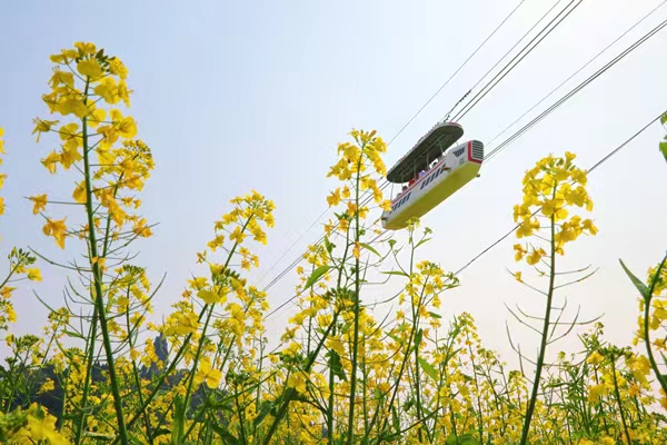 據了解,今年菜花景區延續游船、小火車和直升機觀光項目,新增花海飛艇與叢林飛越項目,構成上下陳摶山的深度游玩環線。游客可乘坐飛艇從花海核心區上行至陳摶山頂,再依托落差14米的高空索道從陳摶山飛渡到睡仙山,體驗戶外運動的刺激。行至花深處,搭成復古小火車還能觀賞長達4公里的粉色桃林,擁抱春天一路的姹紫嫣紅。
