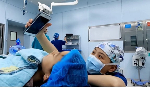 術前醫護人員蹲下身舉著手機里的動畫陪著小患者。重慶北部寬仁醫院供圖