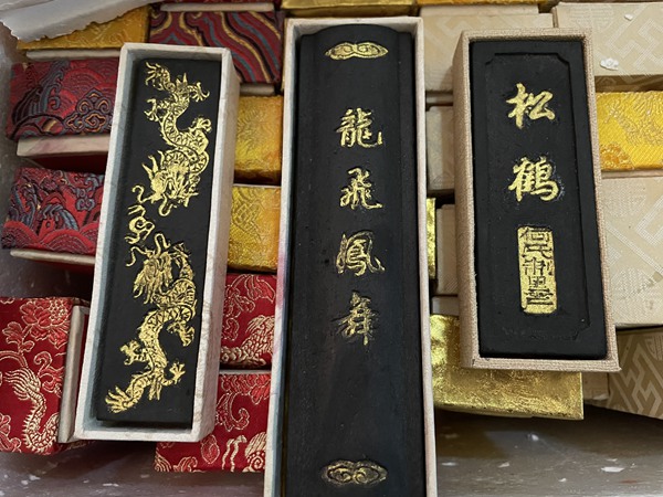 裝入磨具、修邊,雕刻上龍飛鳳舞圖案,用金箔描繪,再陰干一年,這才玉成一錠墨。