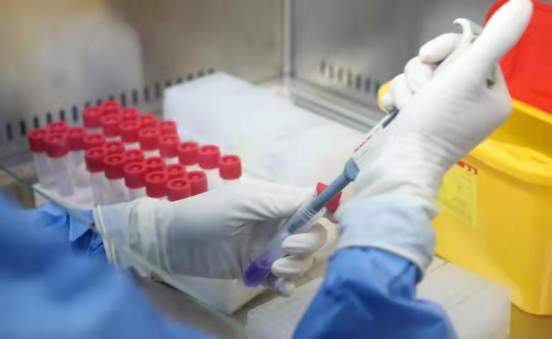 醫務人員在核酸檢測實驗室加入標本。陳仕川 攝