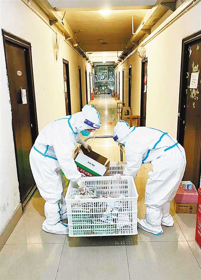 梅苑2、3號樓住著1300余名同學,每天需要送餐4000份。送餐“大白”們除了一日三餐的配送,還要負責學生桶裝水、藥品、日用品等防疫物資的配送。