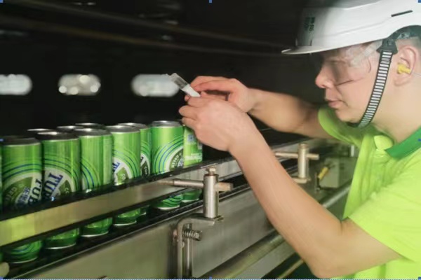 據大竹林酒廠包裝經理張偉介紹,他和團隊一起,對整個工序分析后發現,罐裝好的拉罐啤酒從殺菌機出來,運輸到下一個環節時,殘留在罐底凹槽的水,滴落到地上,浪費了水又污染了地面。正因為這樣,殺菌機的自動補水裝置每天還會自動補水數噸。