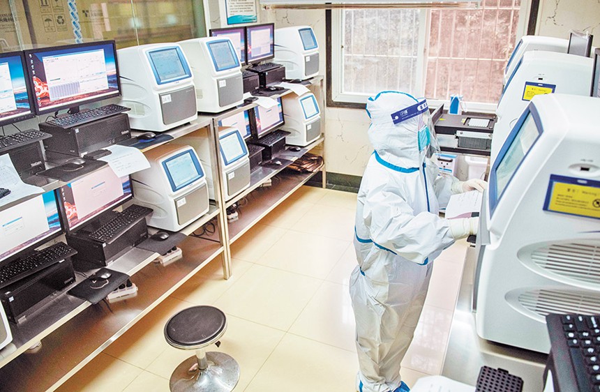 3月26日,市人民醫院檢驗科,工作人員將加樣后的核酸上機檢測。記者 崔力 攝/視覺重慶