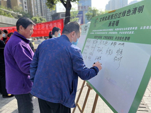 活動現場,天竺路社區黨委書記程朝福宣讀了“文明祭祀·綠色清明”倡議書,號召轄區黨員群眾要做文明祭祀的宣傳者、踐行者和監督者,通過在“承諾墻”上簽字承諾、“懷念墻”上哀思寄語,引導大家以敬獻鮮花、植樹綠化、經典誦讀、網絡祭奠等低碳環保的方式開展祭祀活動,主動摒棄不文明的祭祀行為。