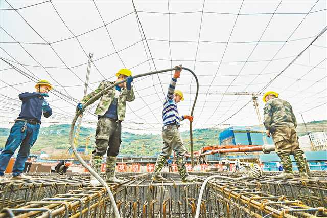 3月24日,西部(重慶)科學城科學大道一期上蓋隧道施工現場,工人正在澆筑混凝土。預計上蓋隧道主體6月完工。