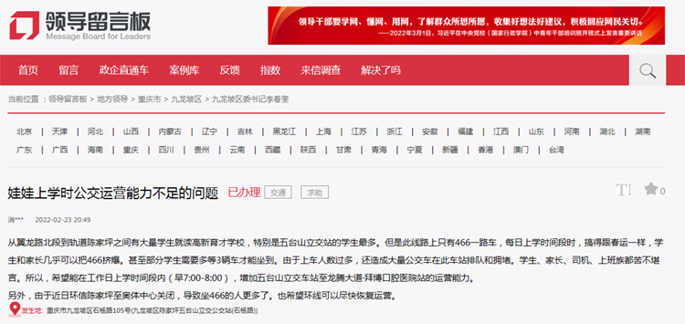網友在2月23日的留言中稱,從九龍坡區翼龍路北段到軌道陳家坪之間有大量學生就讀高新育才學校,特別是五臺山立交站的學生最多!暗窃摼路只有466一路車,學生和家長幾乎把466擠爆,甚至部分學生需要多等3輛車才能坐到。由于上車人數過多,還造成大量公交車在此排隊和擁堵!睂Υ,他建議在工作日上學時間段內(早7:00-8:00),增加該路段公交車運營能力。