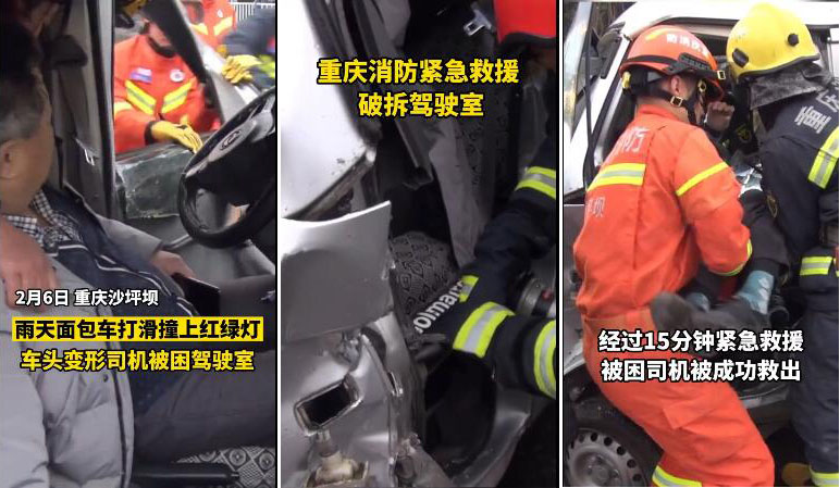 @重慶消防 消息,2月6日,重慶沙坪壩。一輛面包車與紅綠燈桿發生碰撞,面包車車頭嚴重變形,司機腿部被卡,無法動彈。消防人員緊急救援,利用液壓剪切鉗等器材,對駕駛室進行破拆,經過15分鐘的緊張救援,成功救出被困司機。