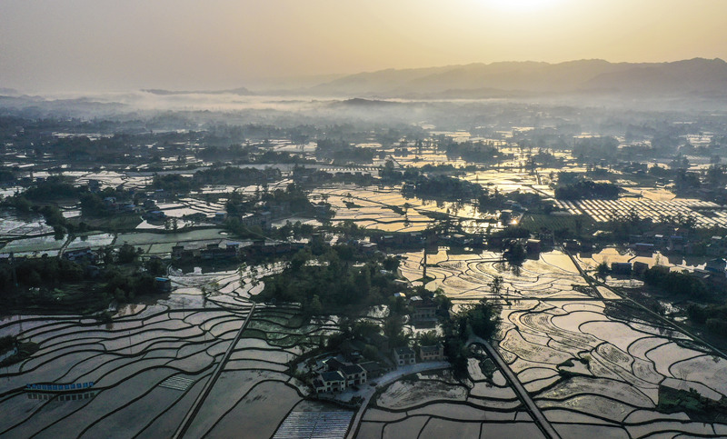 梁平區安勝鎮龍印村,水田在朝陽的映射下美不勝收。熊偉攝