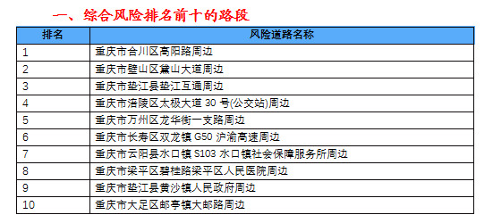 《重慶市2021年度道路交通事故保險理賠風險路段》報告中,綜合風險排名前十的路段。重慶市保險行業協會供圖