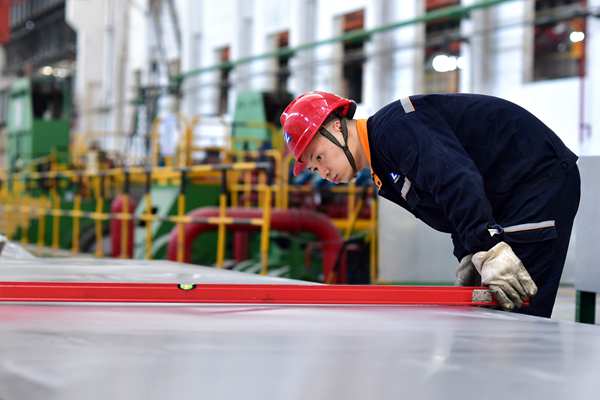 西南鋁厚板生產線員工在檢查鋁合金厚板平直度。西南鋁公司供圖