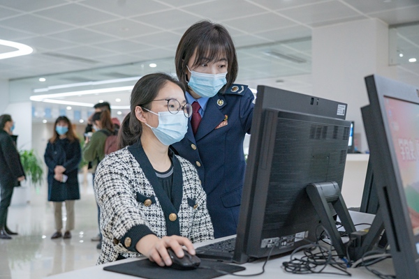 圖為4月1日上午,稅務人員輔導企業辦稅人員通過“點即退”功能申請留抵退稅。郭睿攝