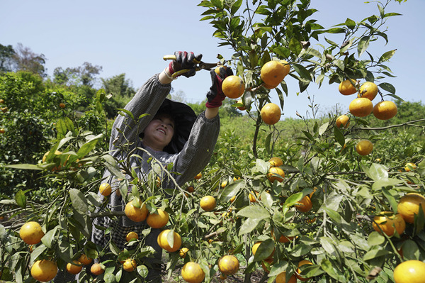 村民在五一村沃柑種植基地采摘晚熟沃柑。秦廷富攝