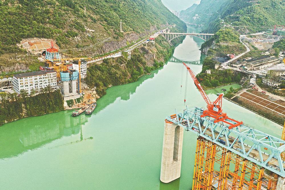 4月2日,在彭水自治縣渝湘高鐵清水坪烏江大橋建設現場,工人們正在加快推進項目建設。