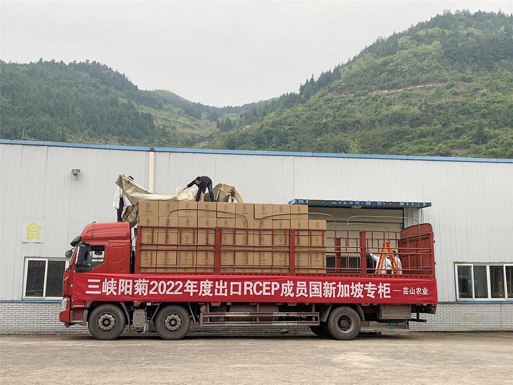 伴隨長長的汽笛聲,近日,一輛滿載三峽陽菊的大卡車從云陽縣紅獅鎮蕓山農業加工廠緩緩駛出,這意味著三峽陽菊已連續四年成功出口。同時,這也是今年一月區域全面經濟伙伴關系協定(RCEP)生效以來,三峽陽菊實現的首次出口。