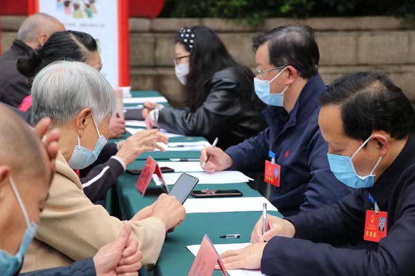 不一會兒,幾位人大代表面前都圍滿了群眾,大家各自反映著自己所遇到的城市建設、社會保障,醫療衛生、教育等方面的難題。幾位人大代表們一邊耐心傾聽、一邊認真記錄,不時還一同討論解決辦法。