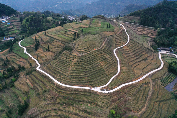 在蜿蜒的盤山公路旁,一片層層疊疊的茶園,坐落于青山綠水間。又是一年春茶開采時,放眼望去,一排排整齊的茶樹吐露新芽,茶香滿園。遠遠望去,碧綠的茶園,一眼望不到邊,蔚藍的天空和綠色的茶園融為一體。