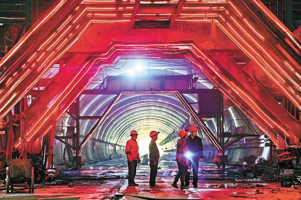 4月6日,西部(重慶)科學城金鳳隧道工程(主城區段),工人正在隧道里加緊作業。隧道預計今年10月貫通,整個工程2024年完工。