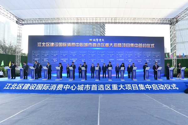 儀式上,江北區還舉行國際消費中心城市首選區重大招商項目集中簽約活動,本次簽約有中環萬象城、陜西延長石油集團西部銷售中心、南亞未來集團翡翠珠寶產業、遠東時代購物廣場等13個項目,投資規模超150億元。